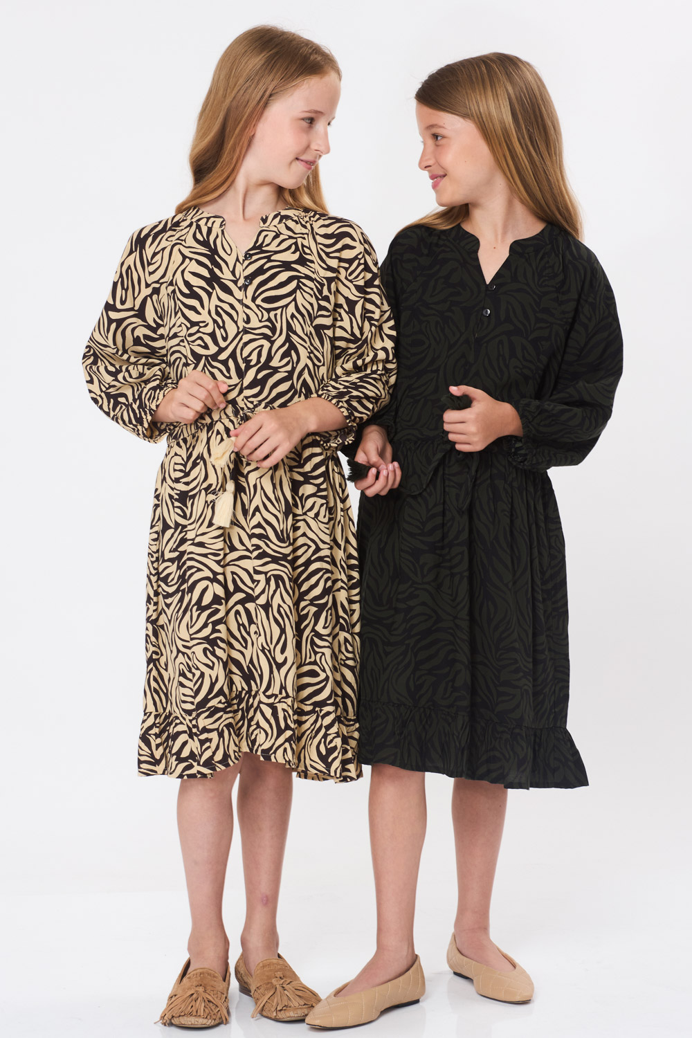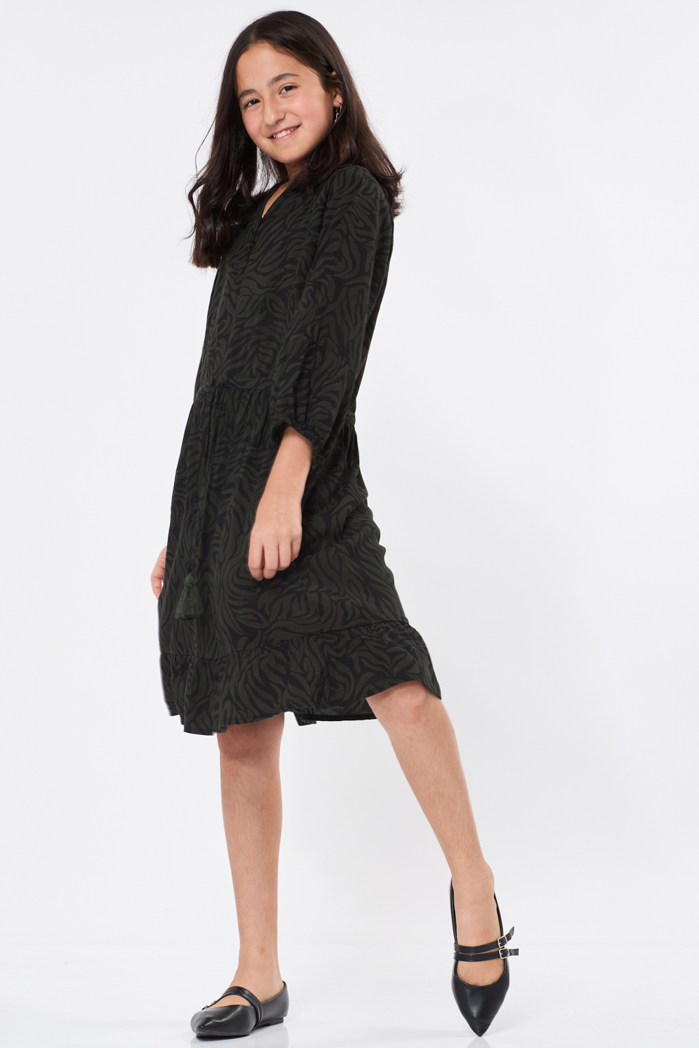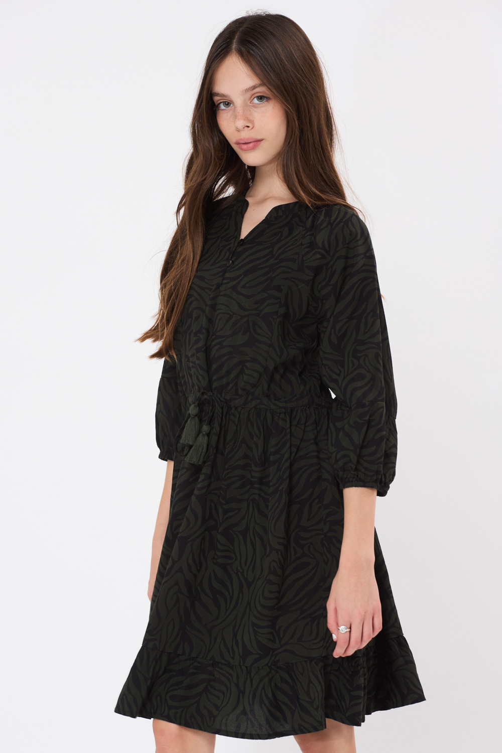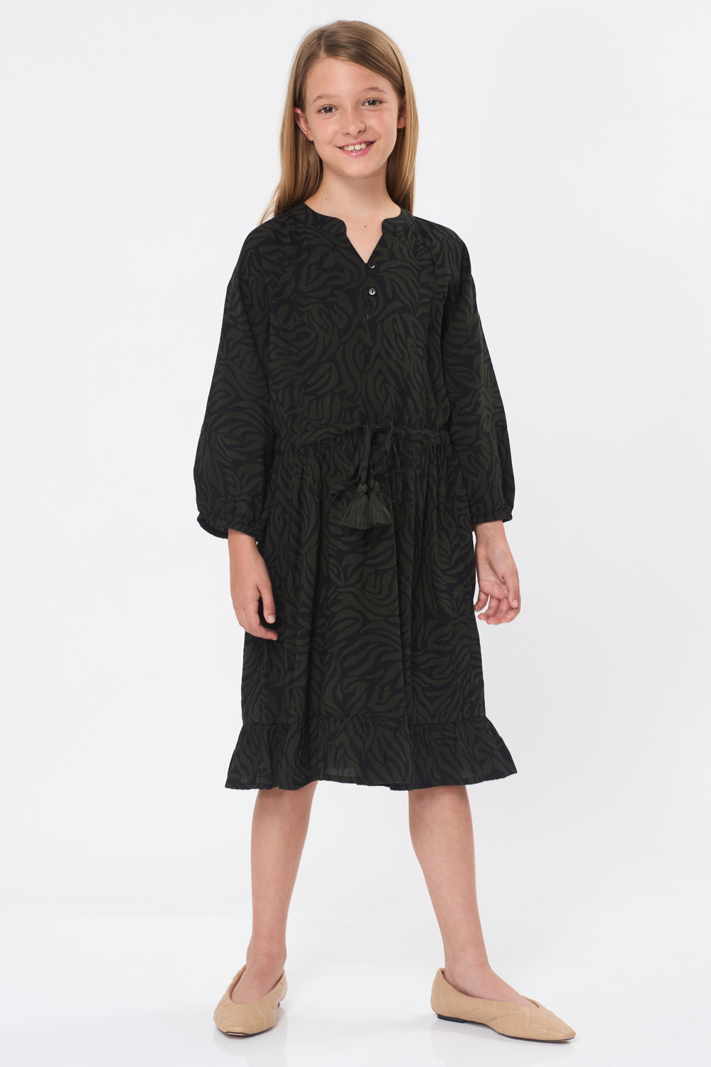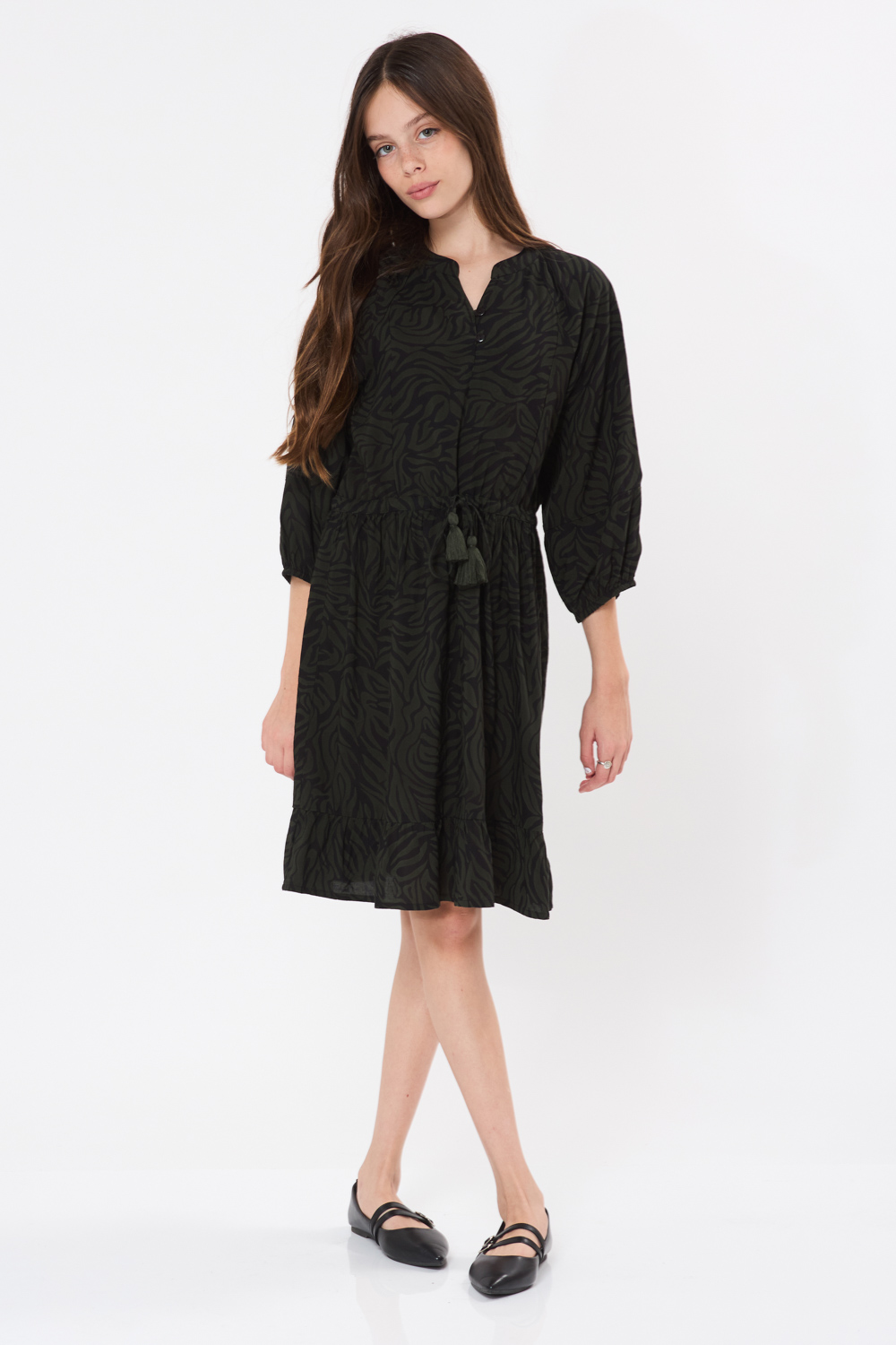 שמלה מודפסת כפתורים בחלק עליון שרוולים רחבים בסיומת גומי שרוך קשירה מתכוונן במותן בסיומת פונפונים