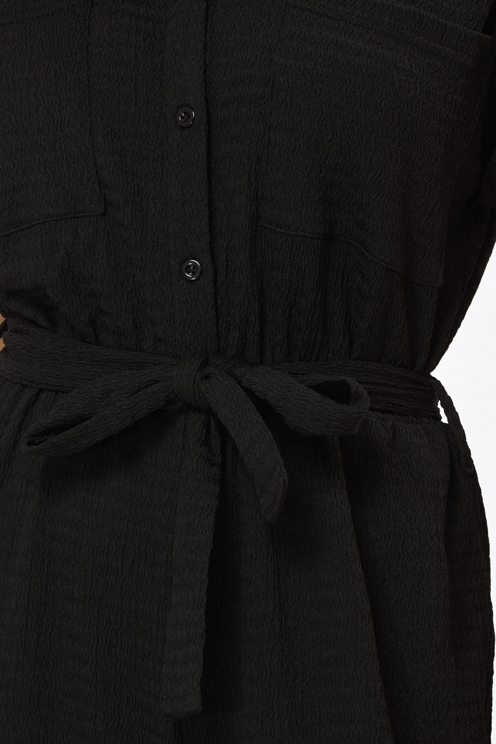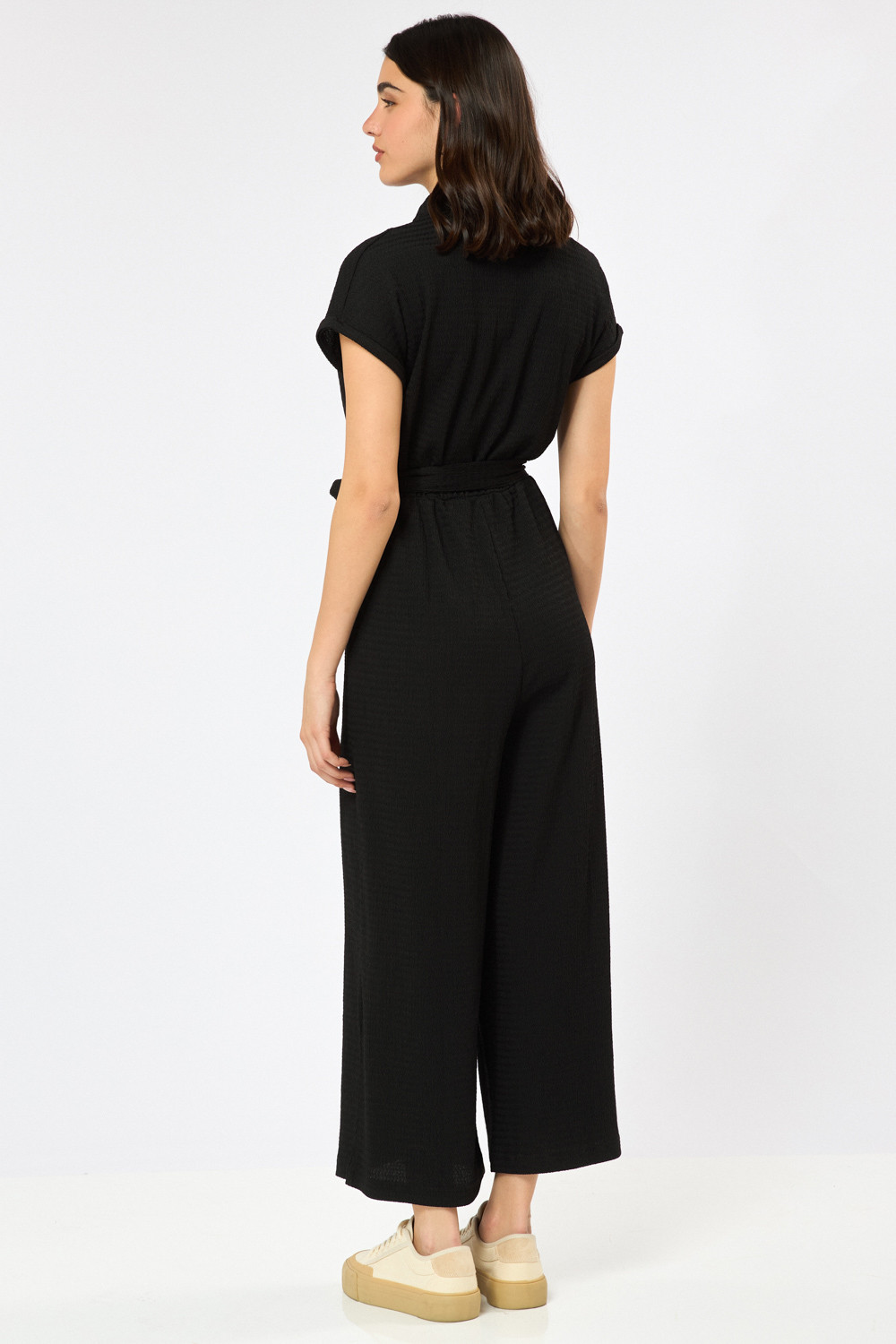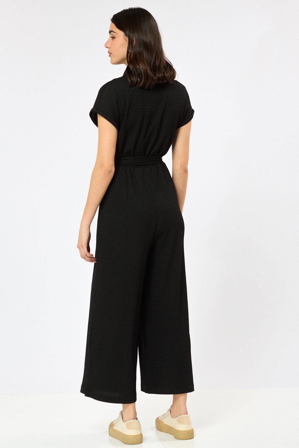 אוברול באורך מידי בגזרה ישרה-משוחררת. צווארון סגור עם סגירת כפתורים קדמית ושרוולים קצרים. חגורת קשירה במותן ומכנסיים מתרחבים, בד סריג עם טקסטורה.