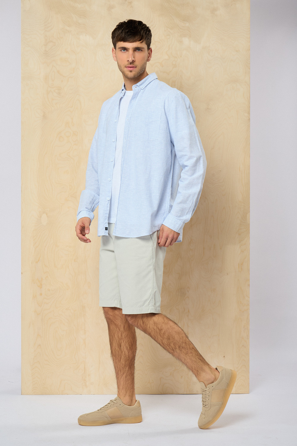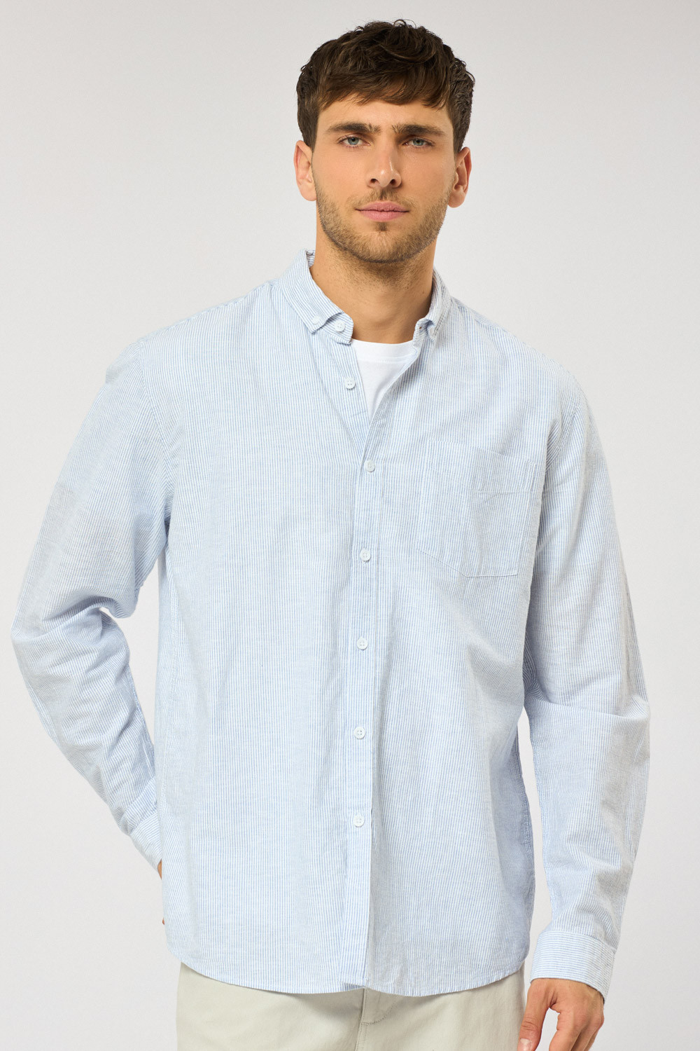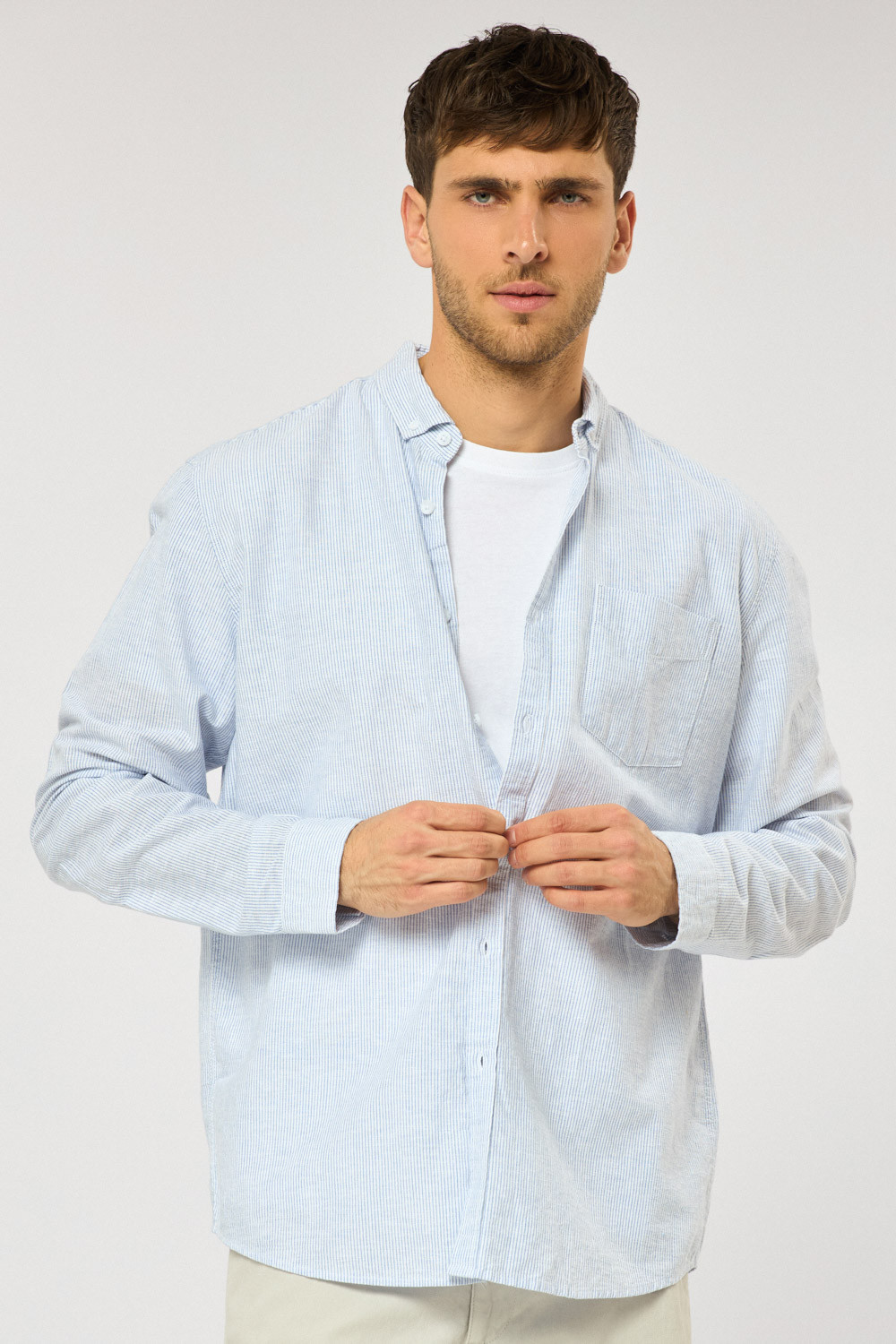 חולצה מכופתרת בשילוב פשתן גזרה רחבה - כחול בהיר