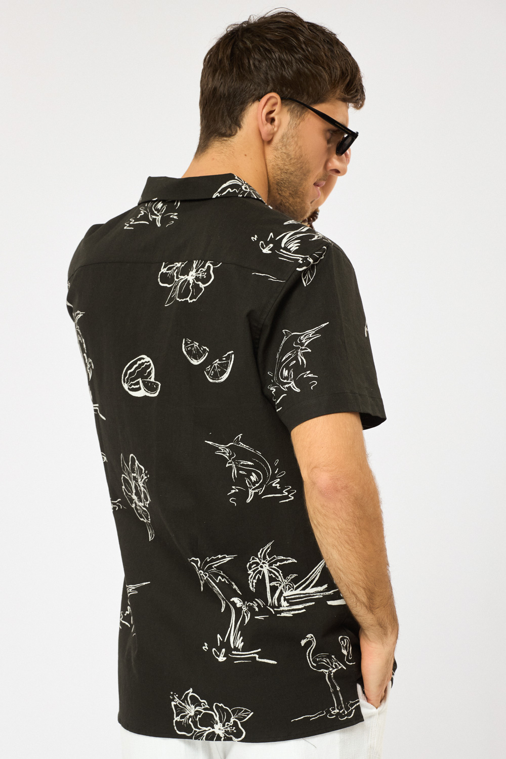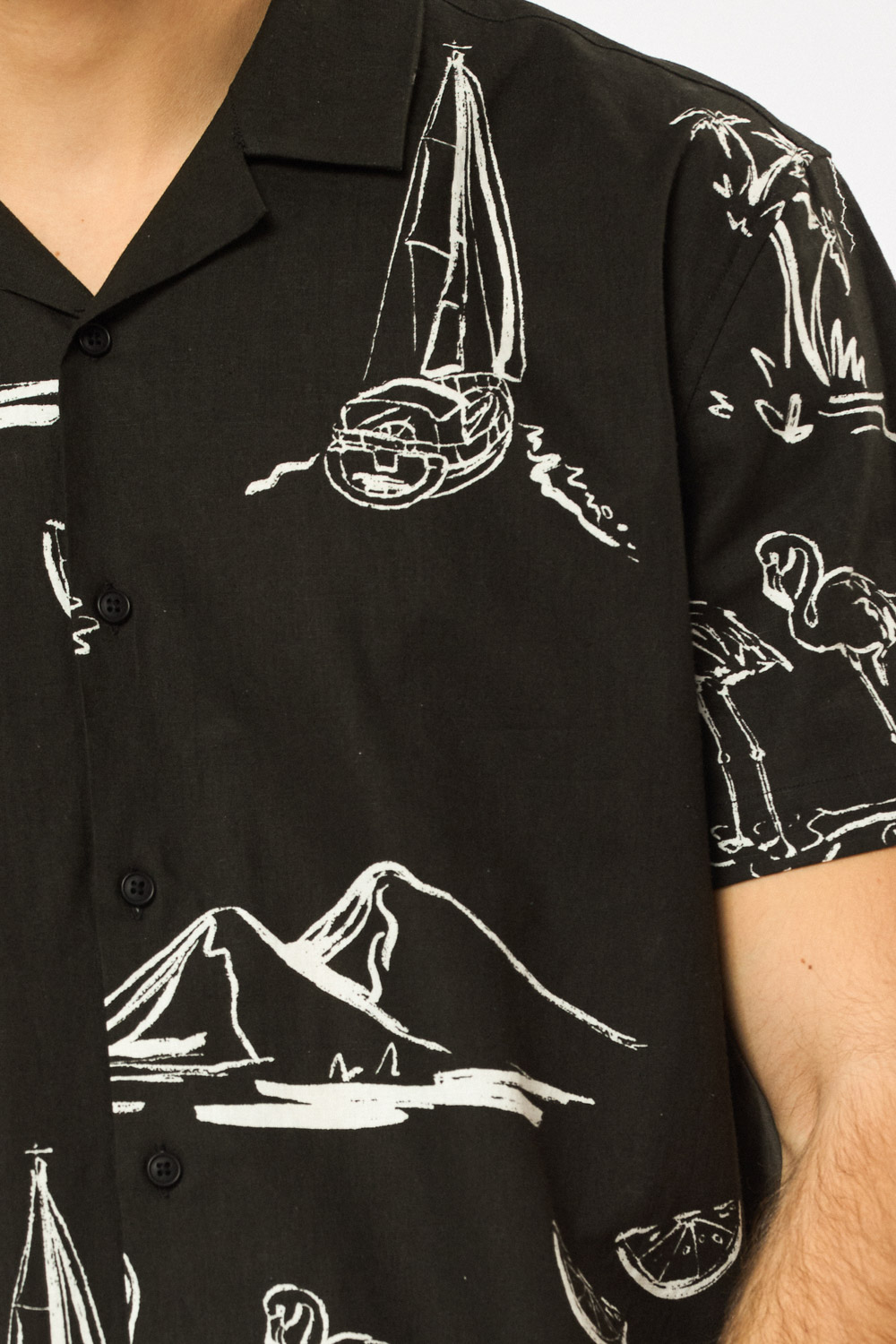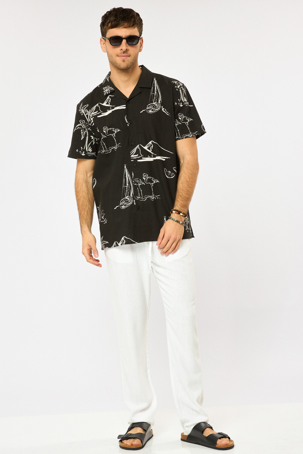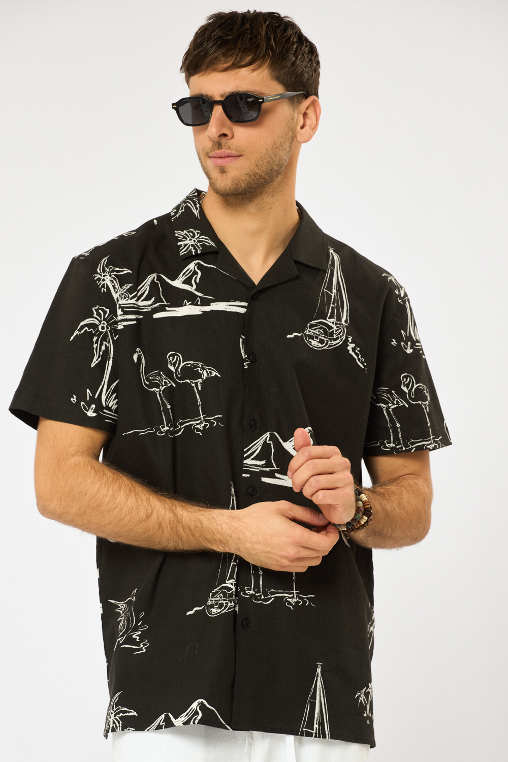 חולצה מכופתרת בד מודפס באיורי טרופי בשחור לבן צווארון קאמפ גזרה רחבה comfort fit