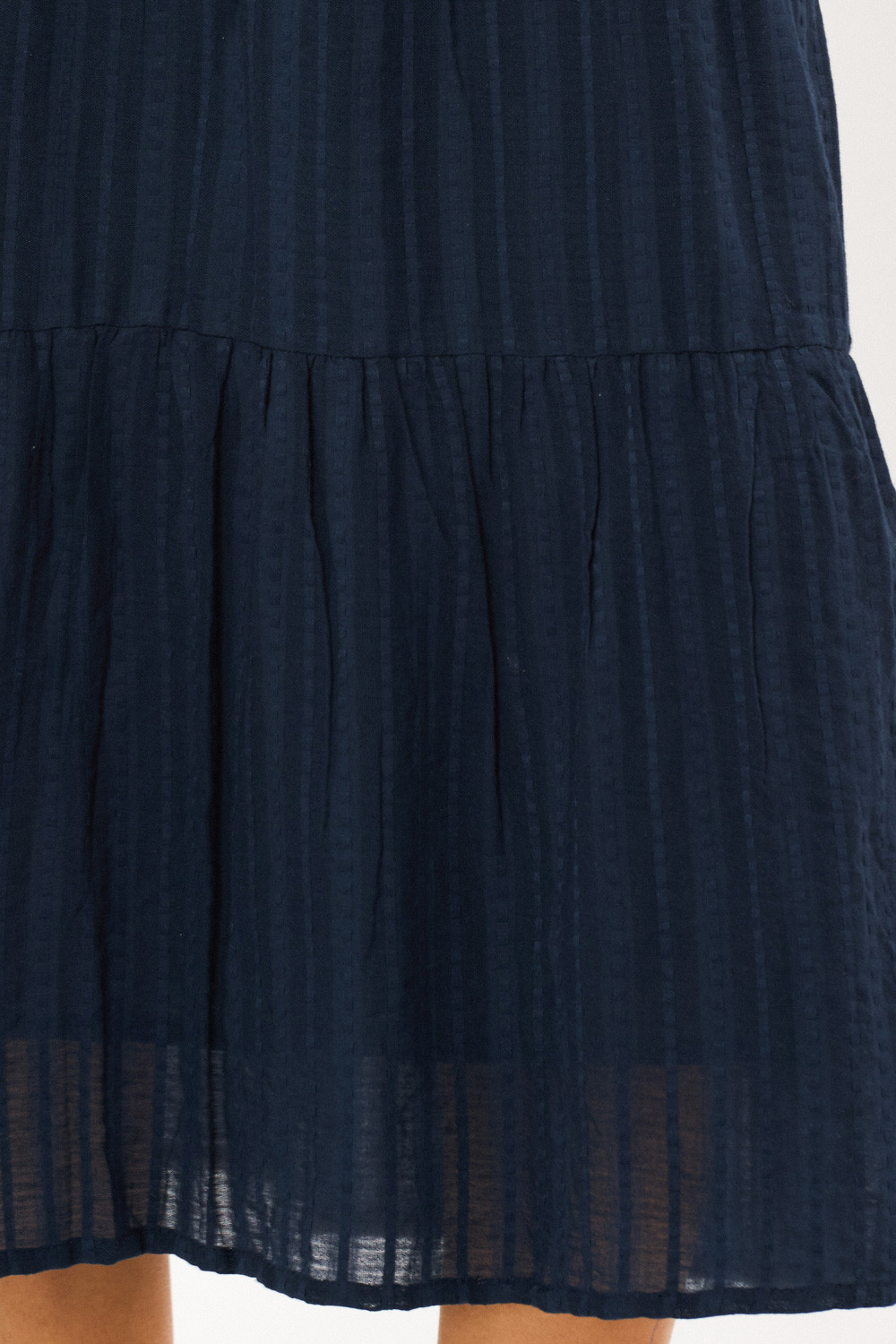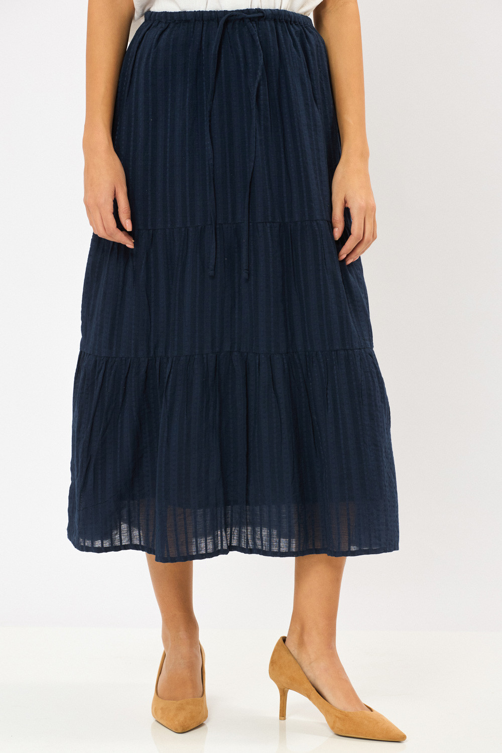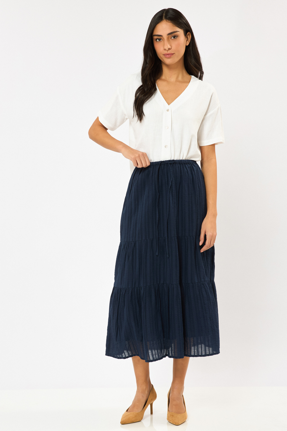 חצאית מקסי בגזרה ישרה־מתרחבת בד כותנה בטקסטורה עדינה מותן עם גומי ושרוך קשירה לנוחות יומיומית