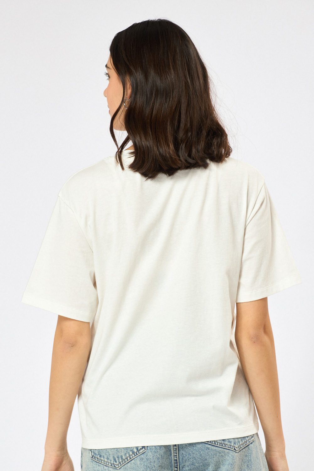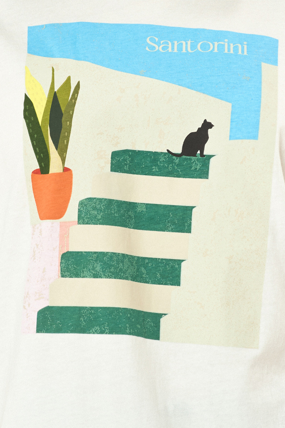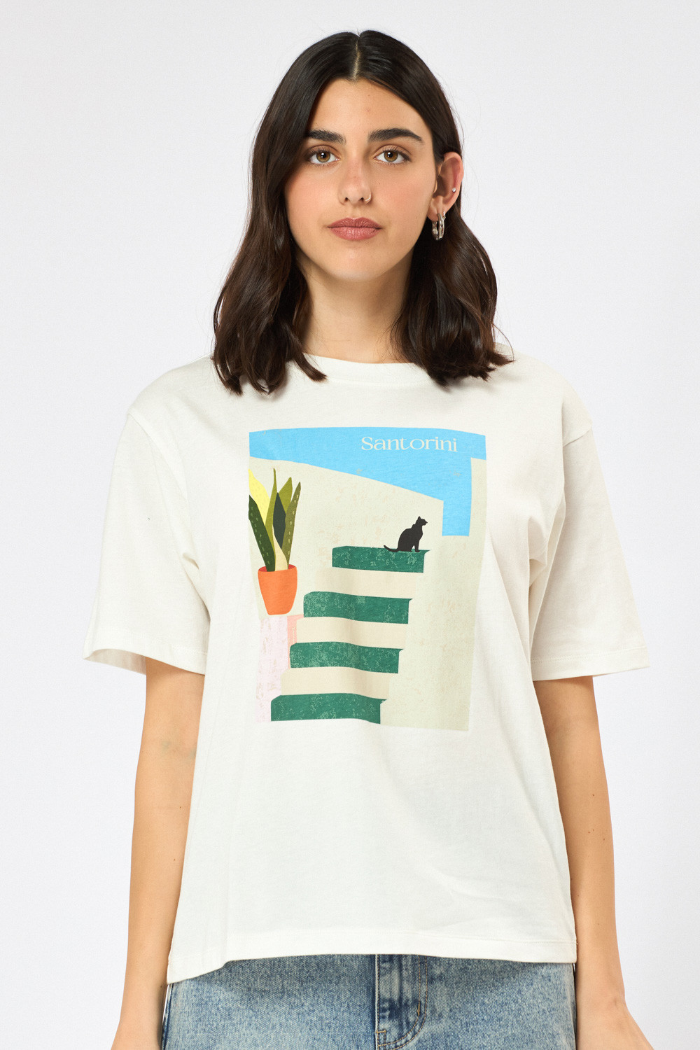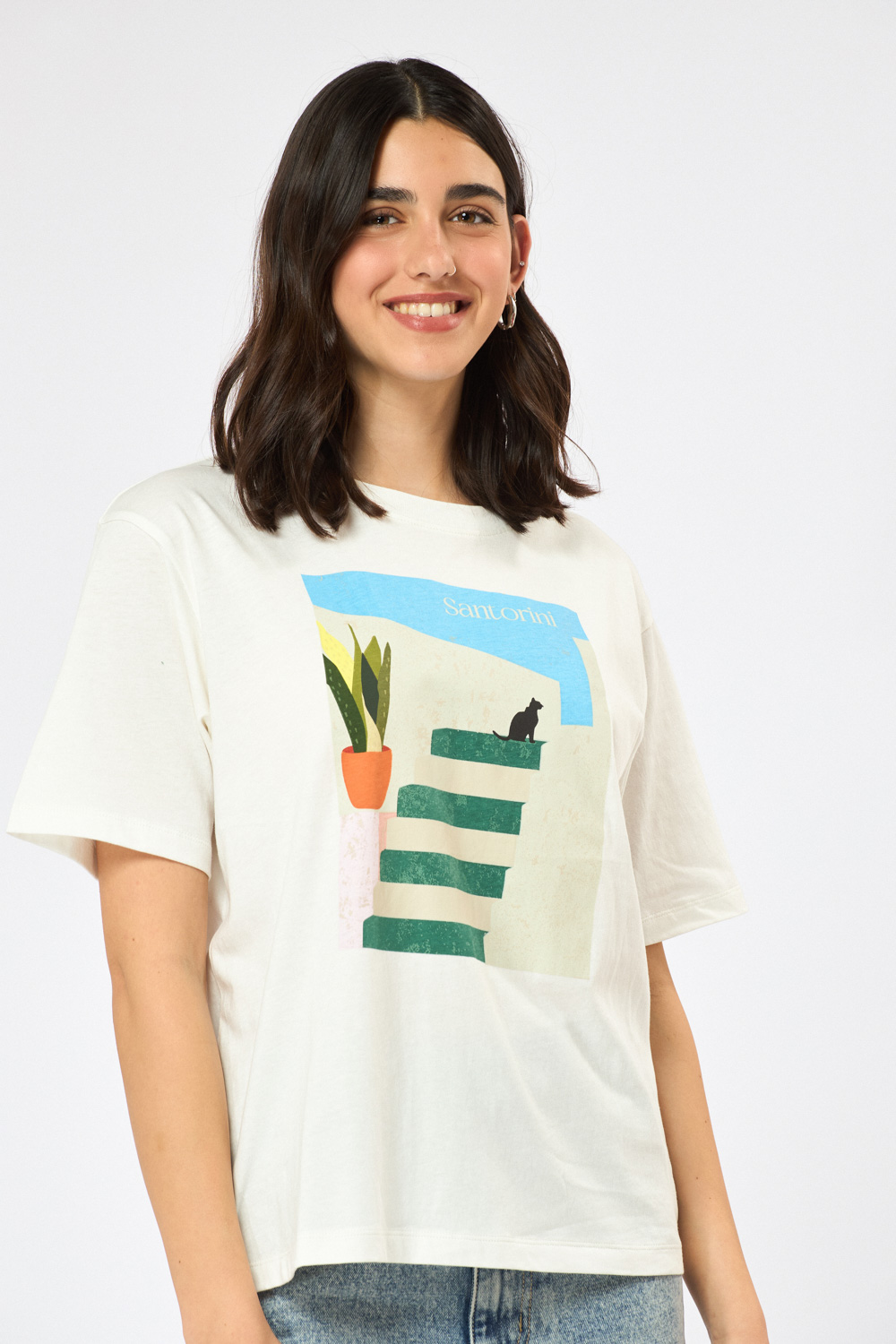 טי שירט עם צווארון עגול, גזרה רחבה הדפס קדמי בהשראת סנטוריני.