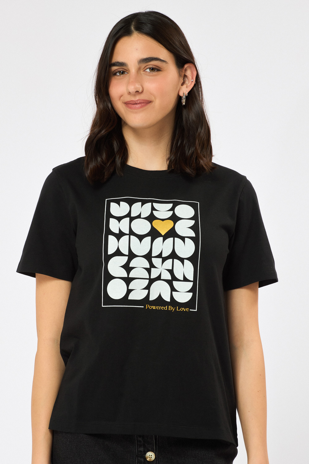 טי שירט עם צווארון עגול, גזרה ישרה הדפס קדמי טיפוגרפי הכולל טקסט וסמל לב.