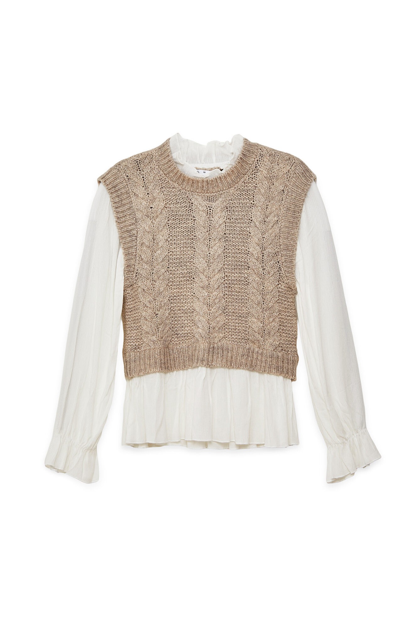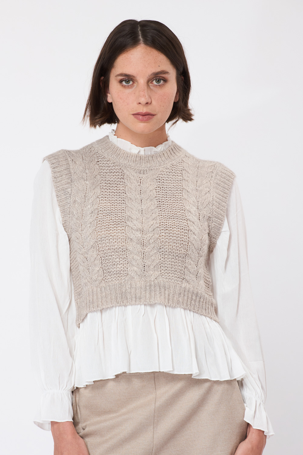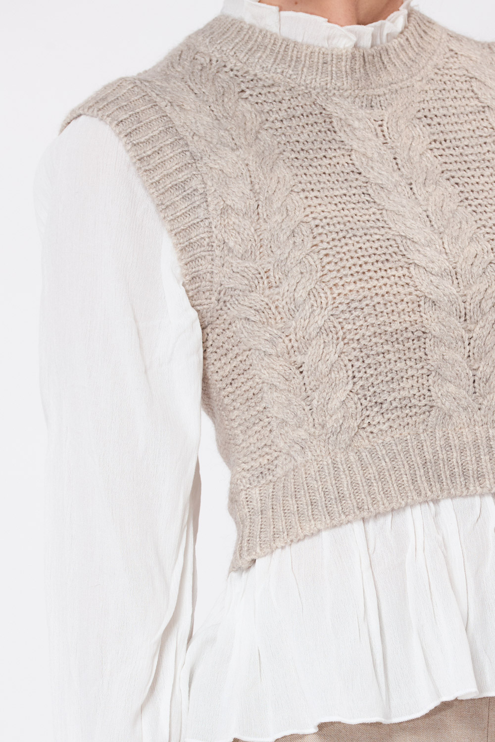 סריג אפור עם דוגמת צמות בשילוב בד אריג נעים הנותן מראה של חולצה ואפודה בסטייל
