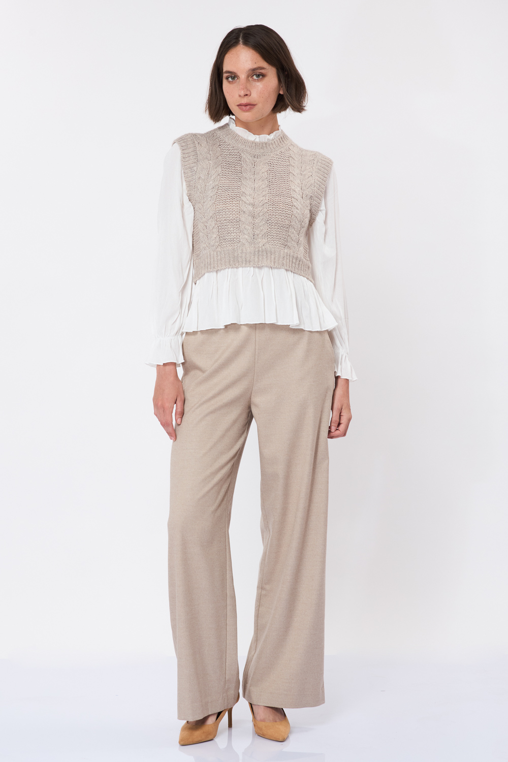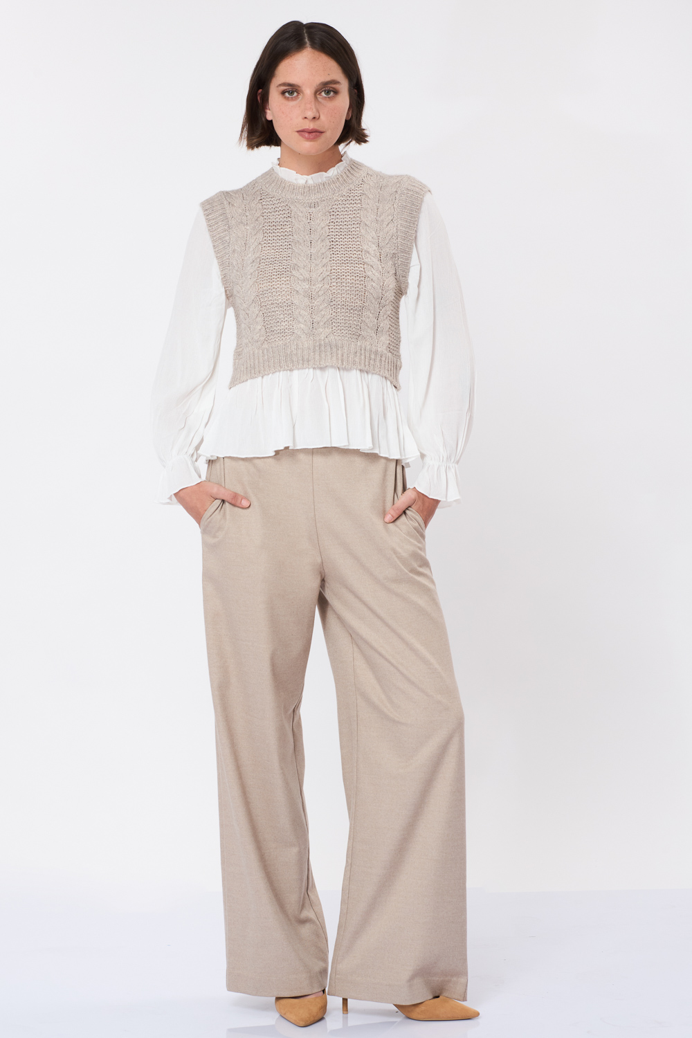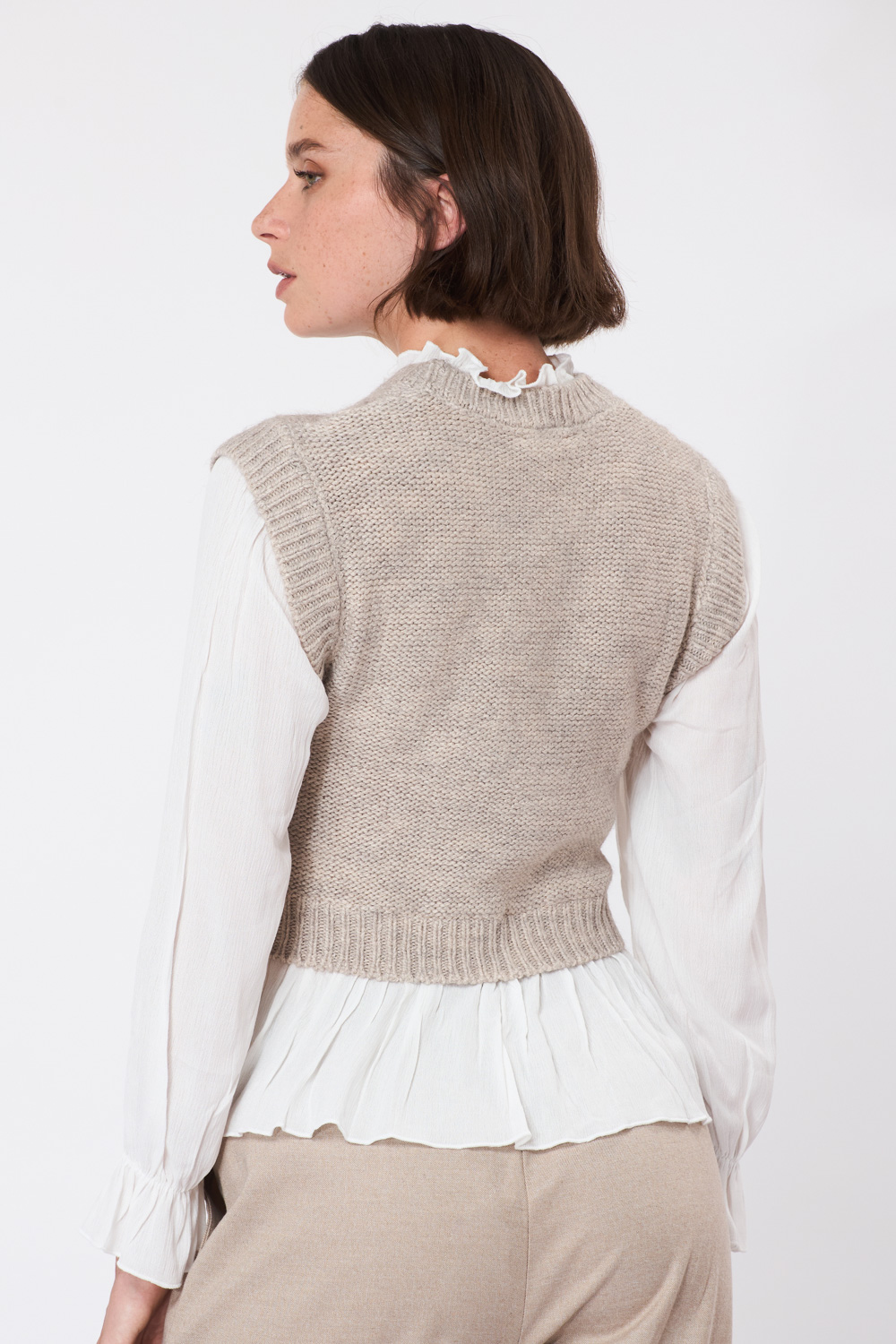 סריג אפור עם דוגמת צמות בשילוב בד אריג נעים הנותן מראה של חולצה ואפודה בסטייל