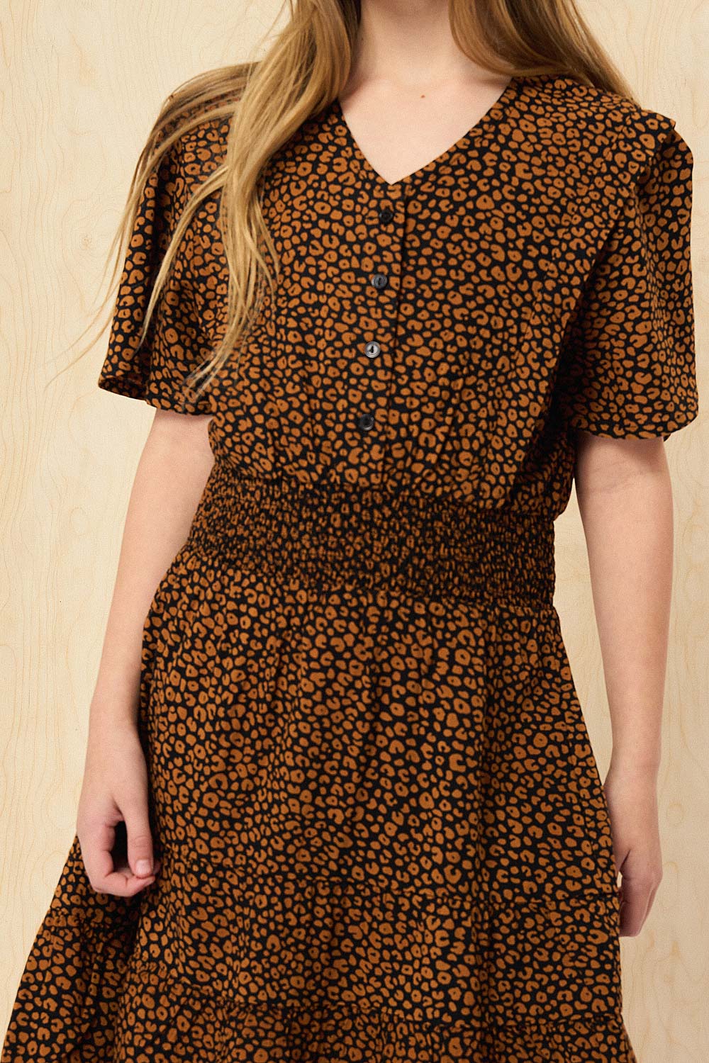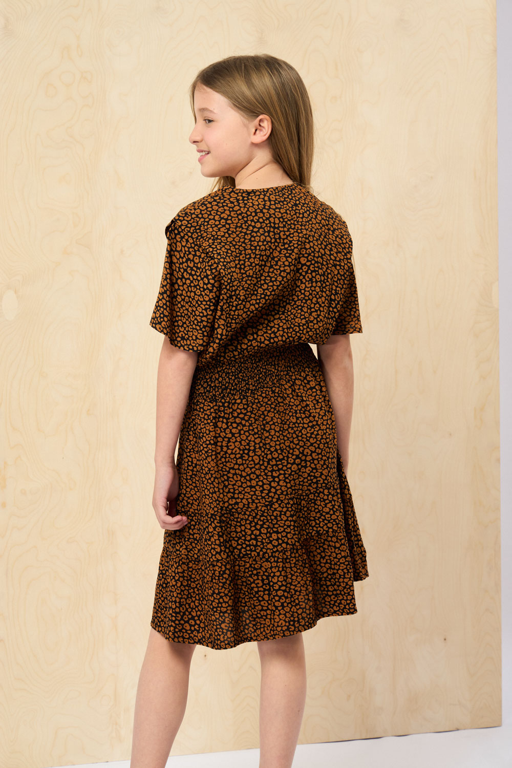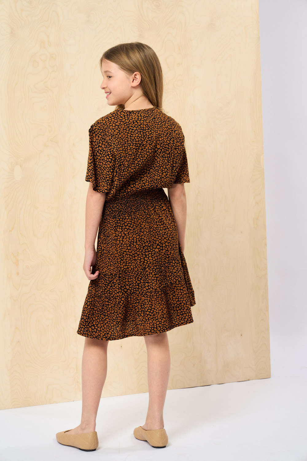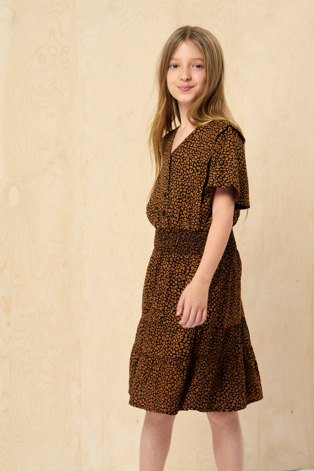 שמלת ילדות בגזרה נינוחה עם גומי במותן. מפתח V וסגירת כפתורים קדמית. שרוולים קצרים מתרחבים.
