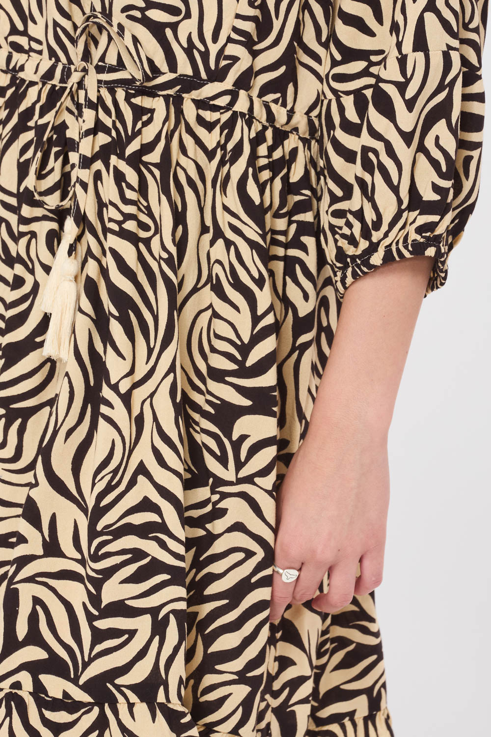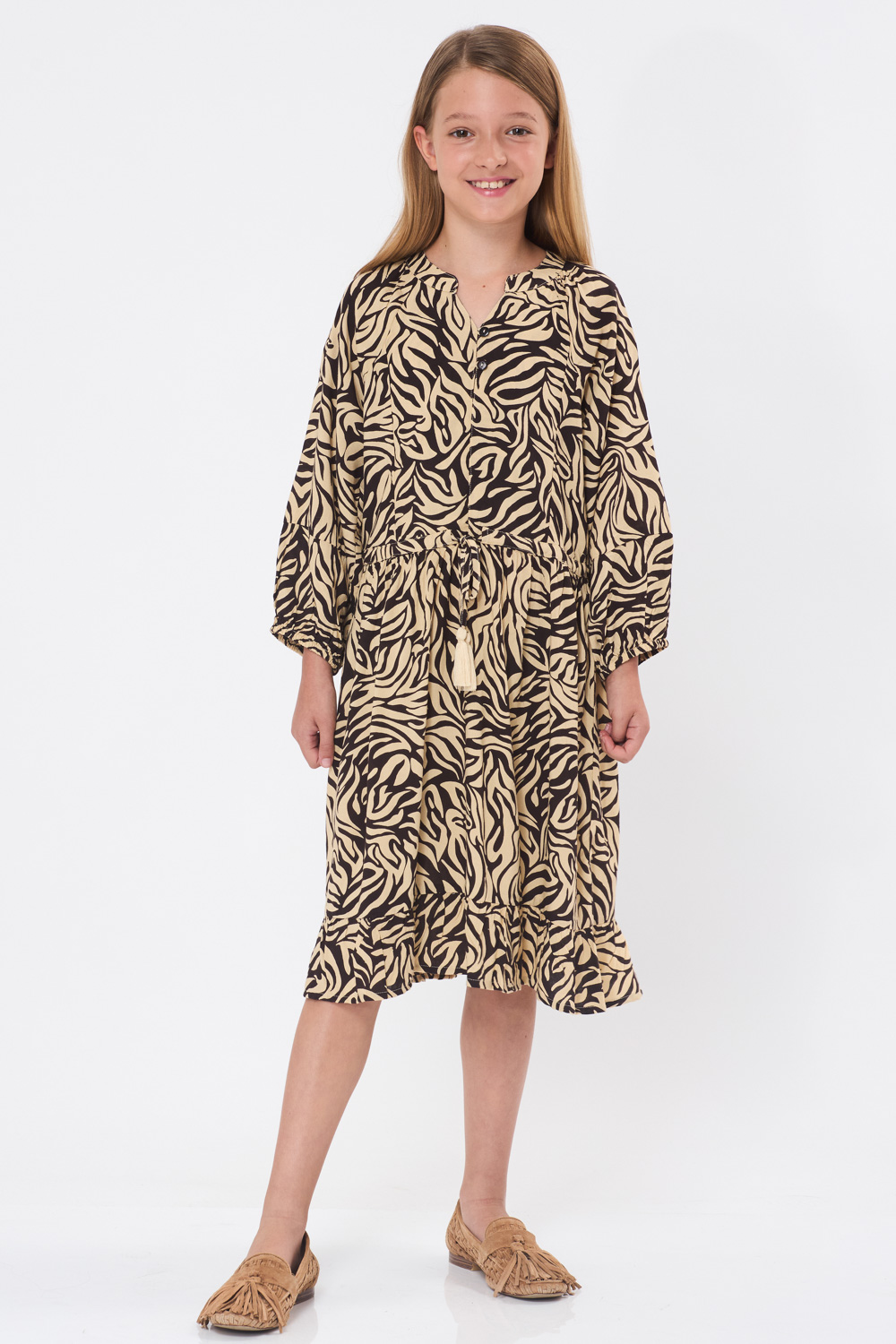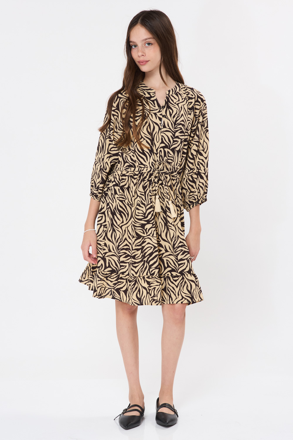 שמלה מודפסת כפתורים בחלק עליון שרוולים רחבים בסיומת גומי שרוך קשירה מתכוונן במותן בסיומת פונפונים