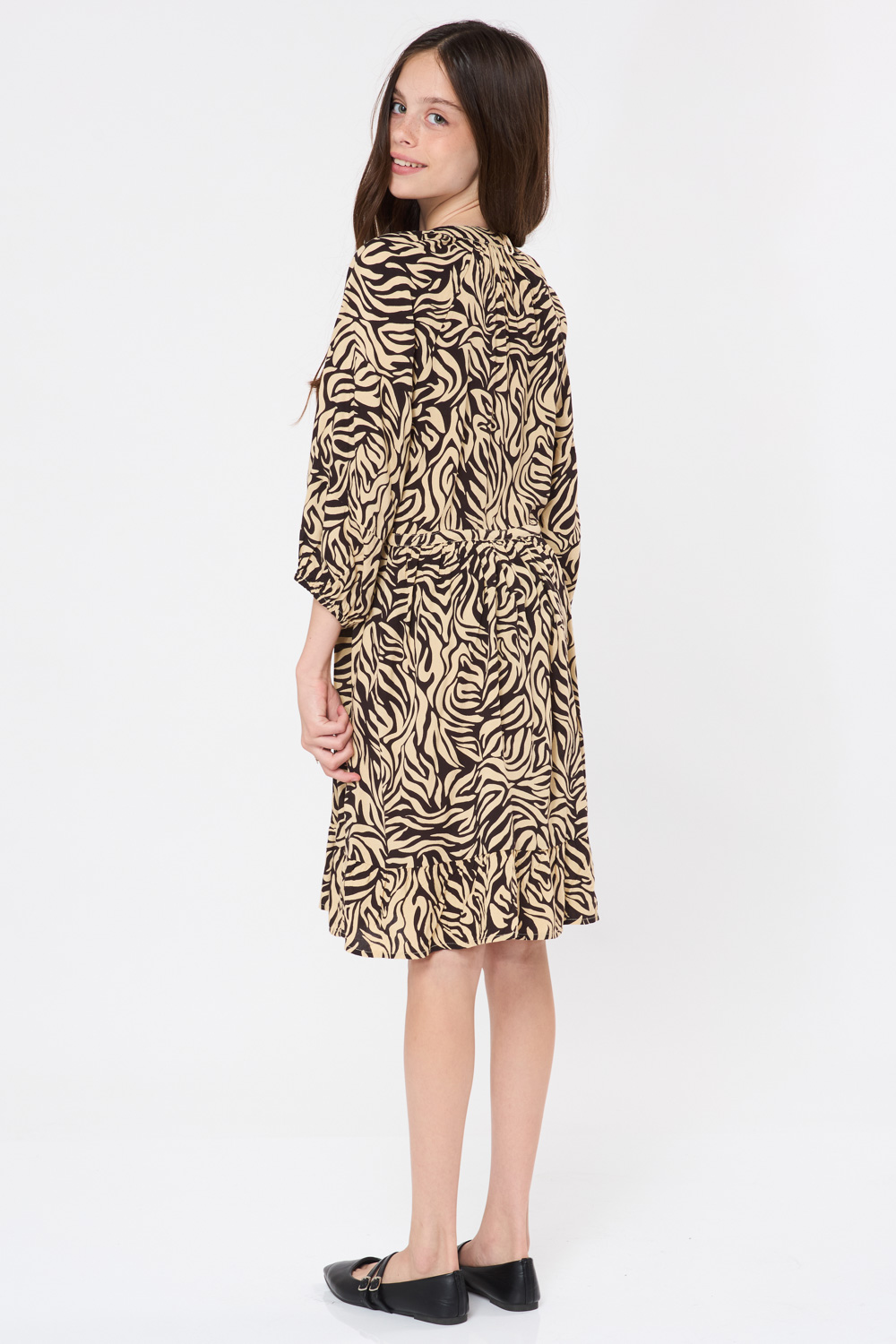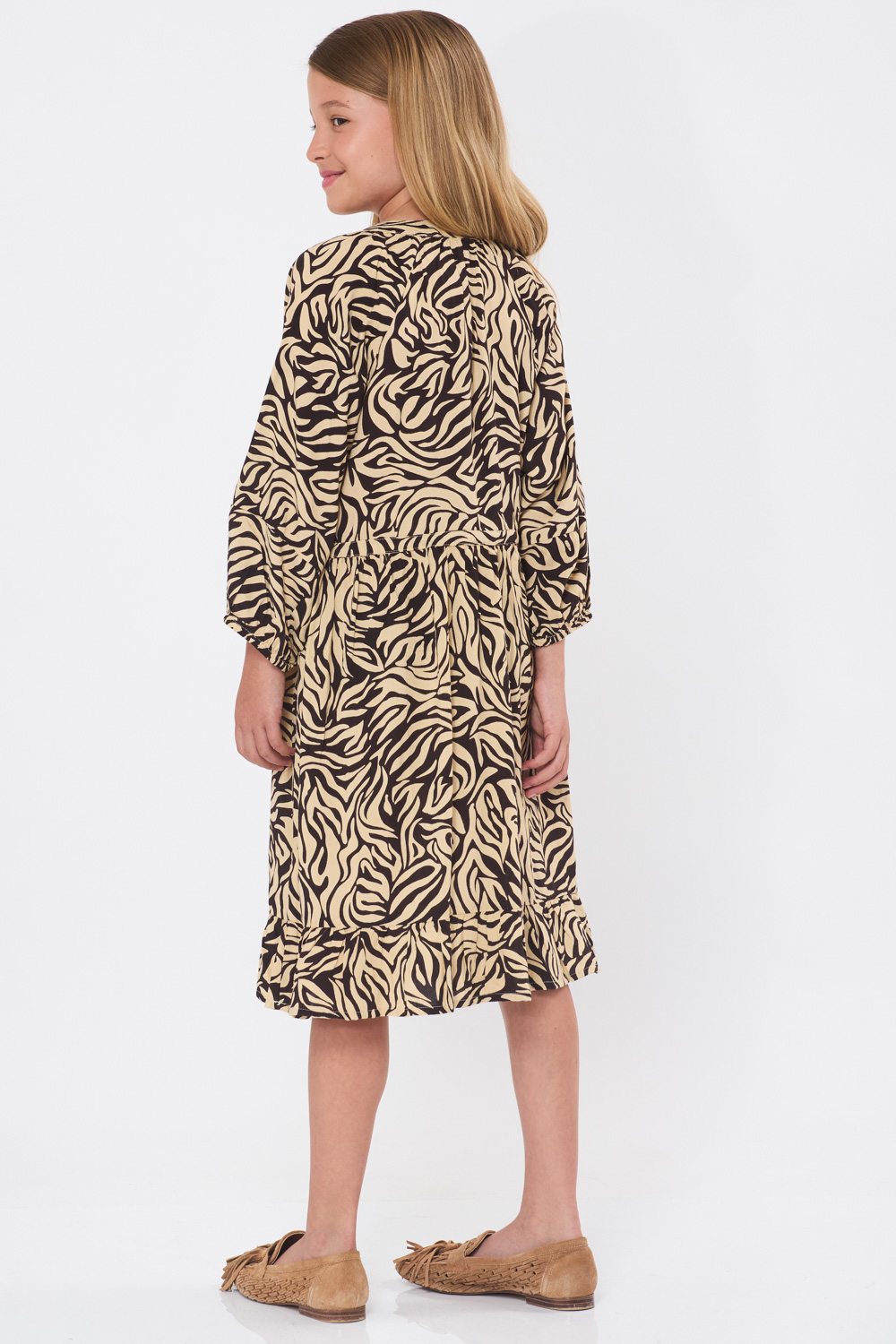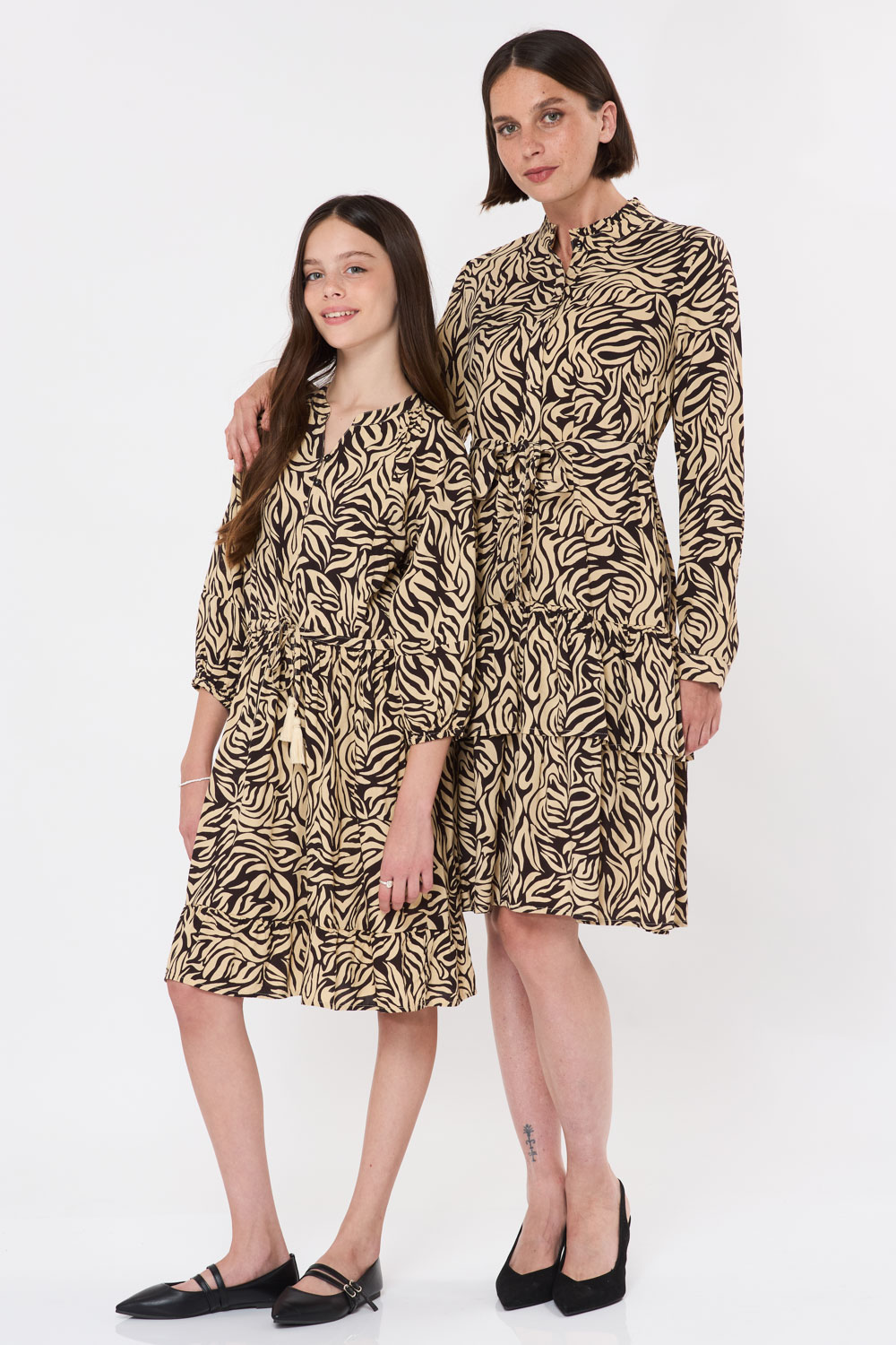 שמלה מודפסת כפתורים בחלק עליון שרוולים רחבים בסיומת גומי שרוך קשירה מתכוונן במותן בסיומת פונפונים