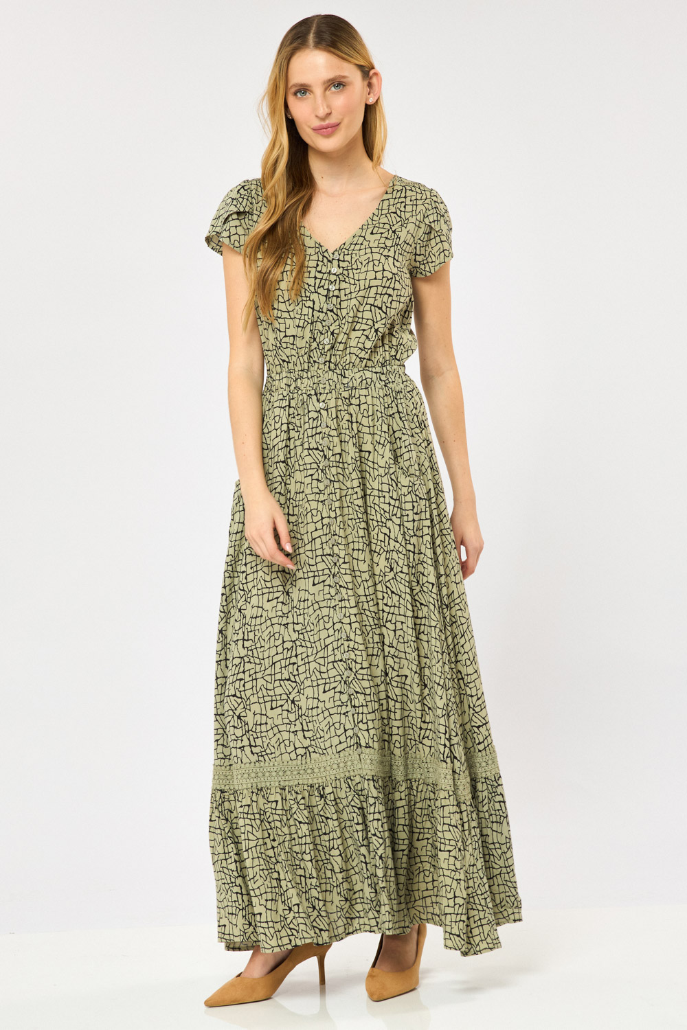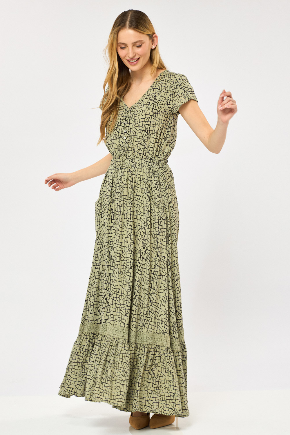 שמלת מקסי מכופתרת לכל האורך בגזרה נשית הדפס קווי מופשט בקונטרסט רך מחשוף V, שרוולים קצרים ומותן מכווצת סיומת מתרחבת עם פס תחרה עדין למראה קליל