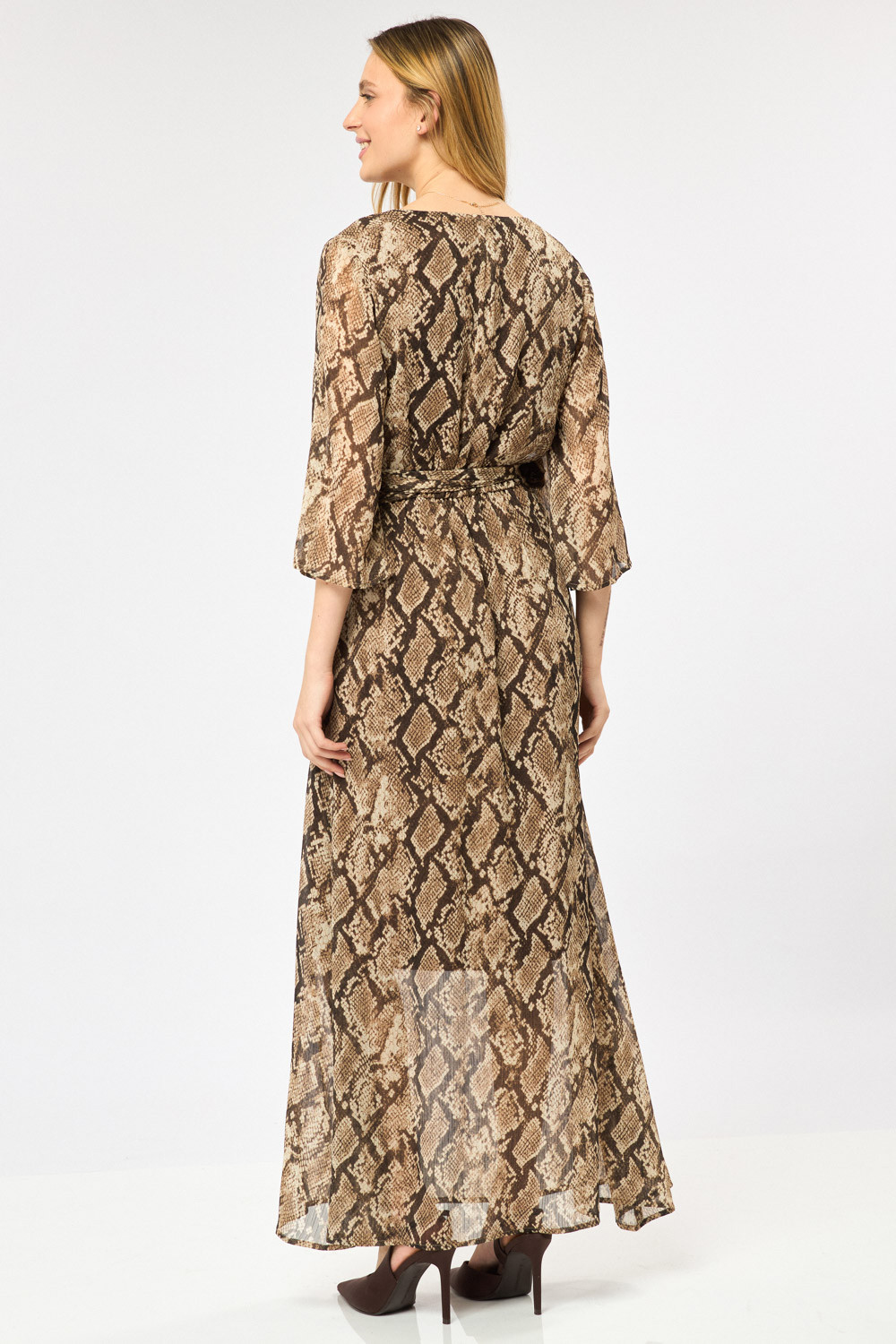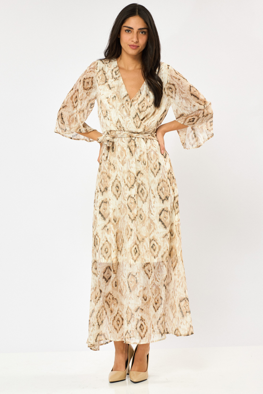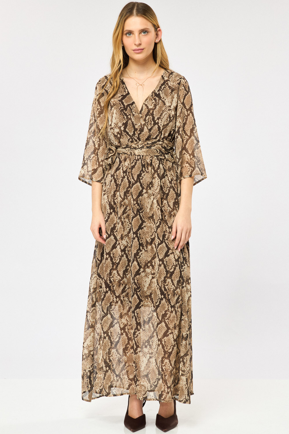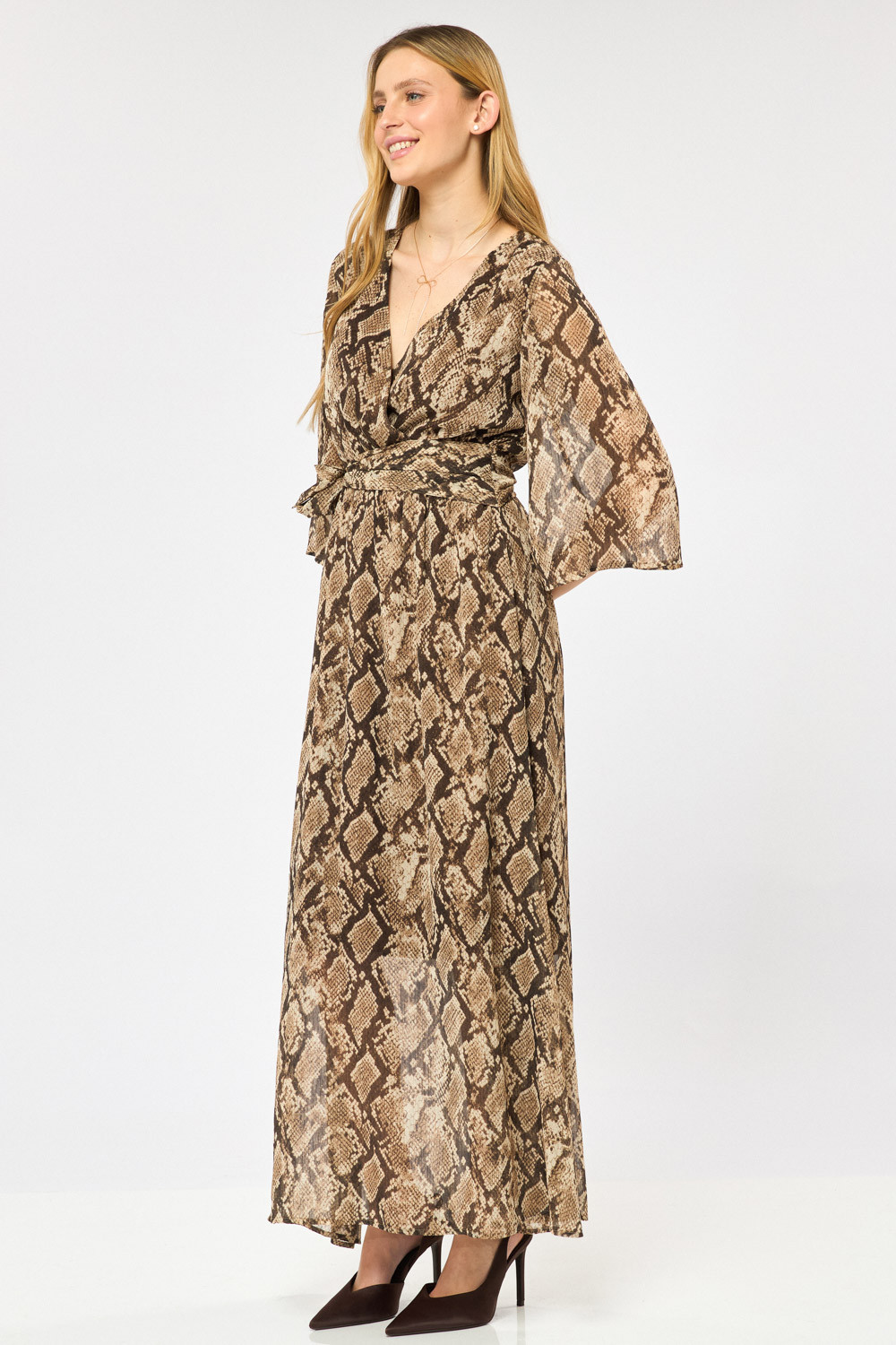 שמלת מקסי מרשימה דפוס חברבורות מחשוף V בגזרת מעטפה שרוולים מתרחבים חגורת קשירה צידית במותן האלסטית