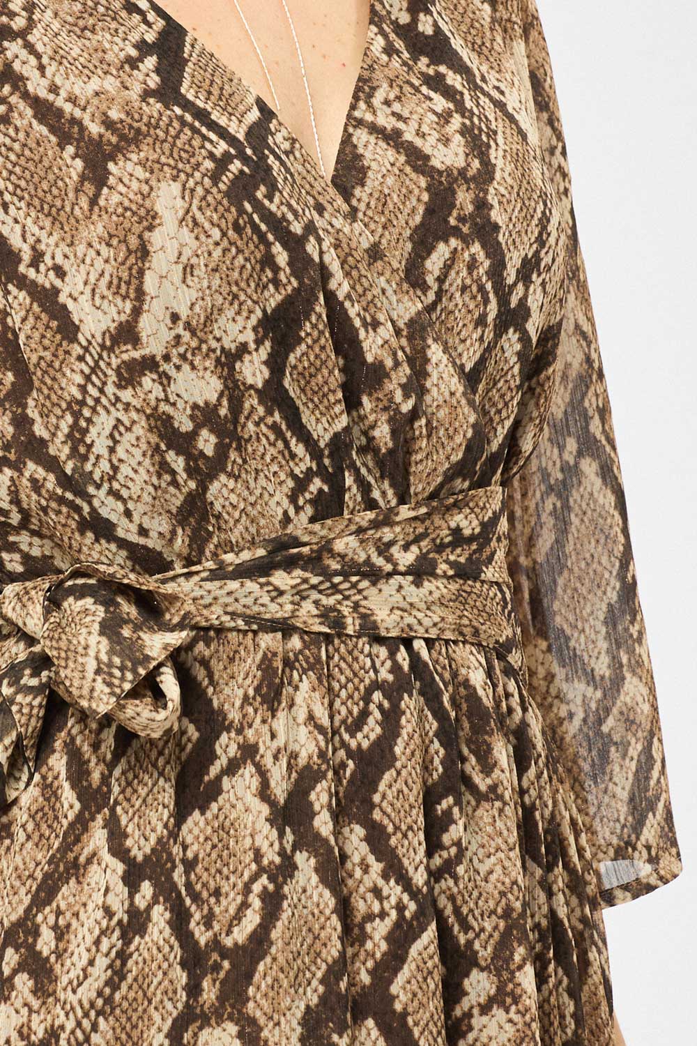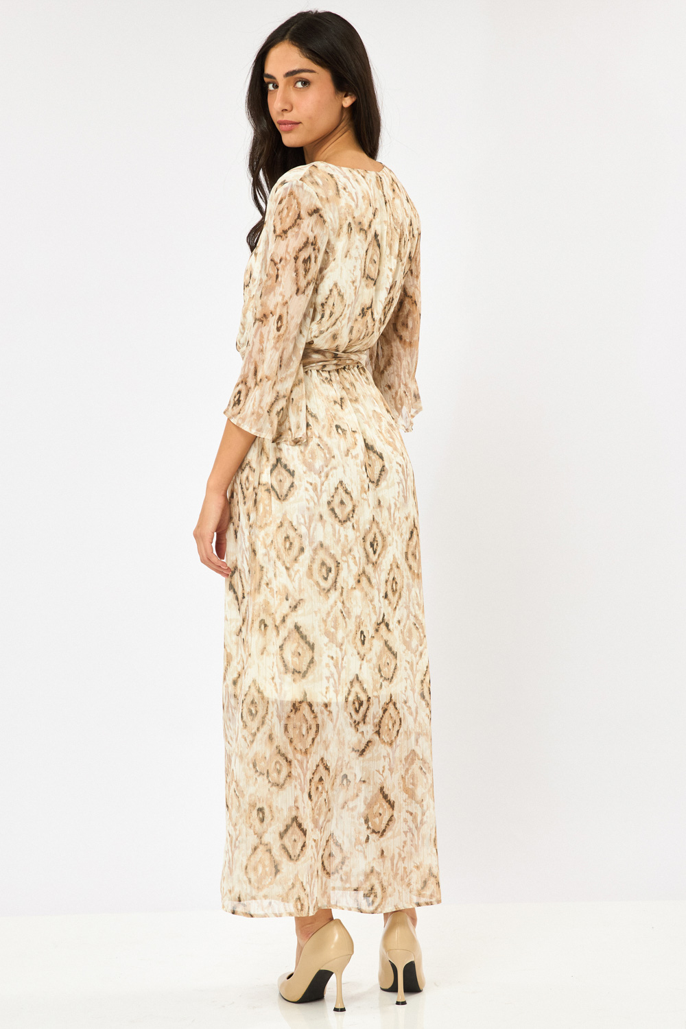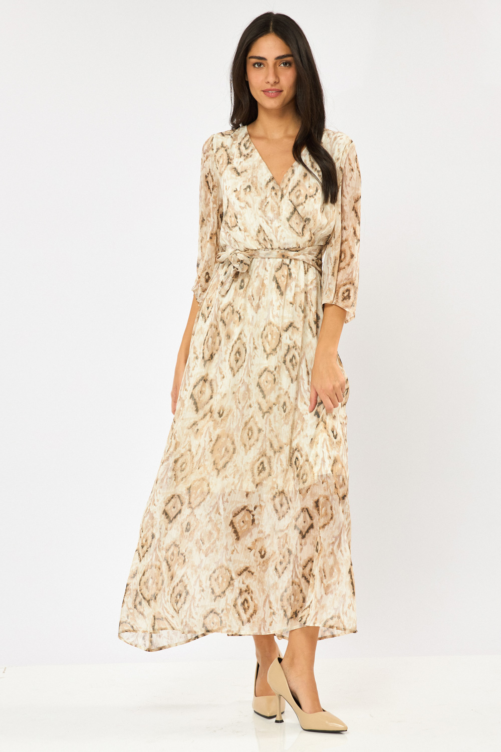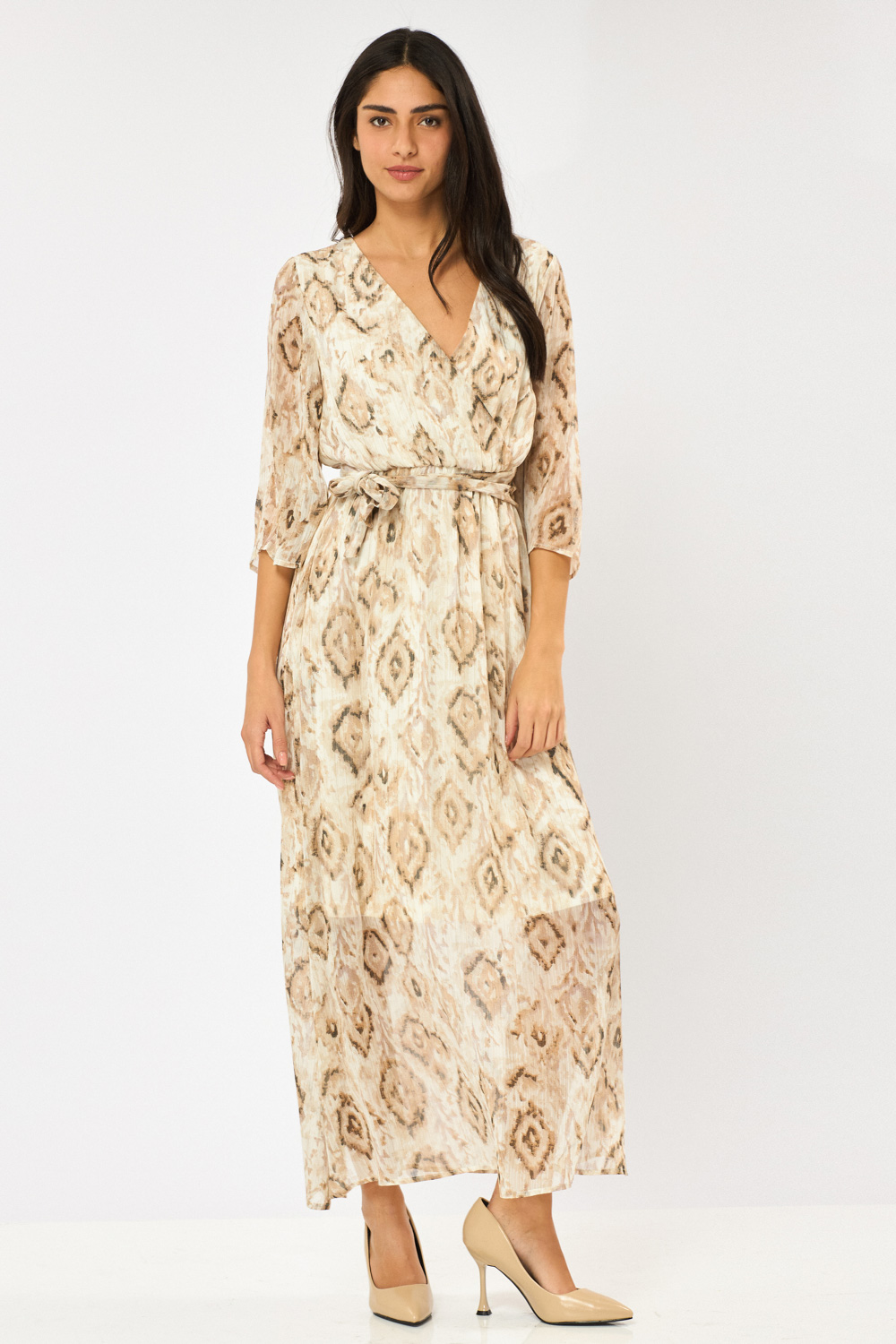 שמלת מקסי מרשימה דפוס חברבורות מחשוף V בגזרת מעטפה שרוולים מתרחבים חגורת קשירה צידית במותן האלסטית