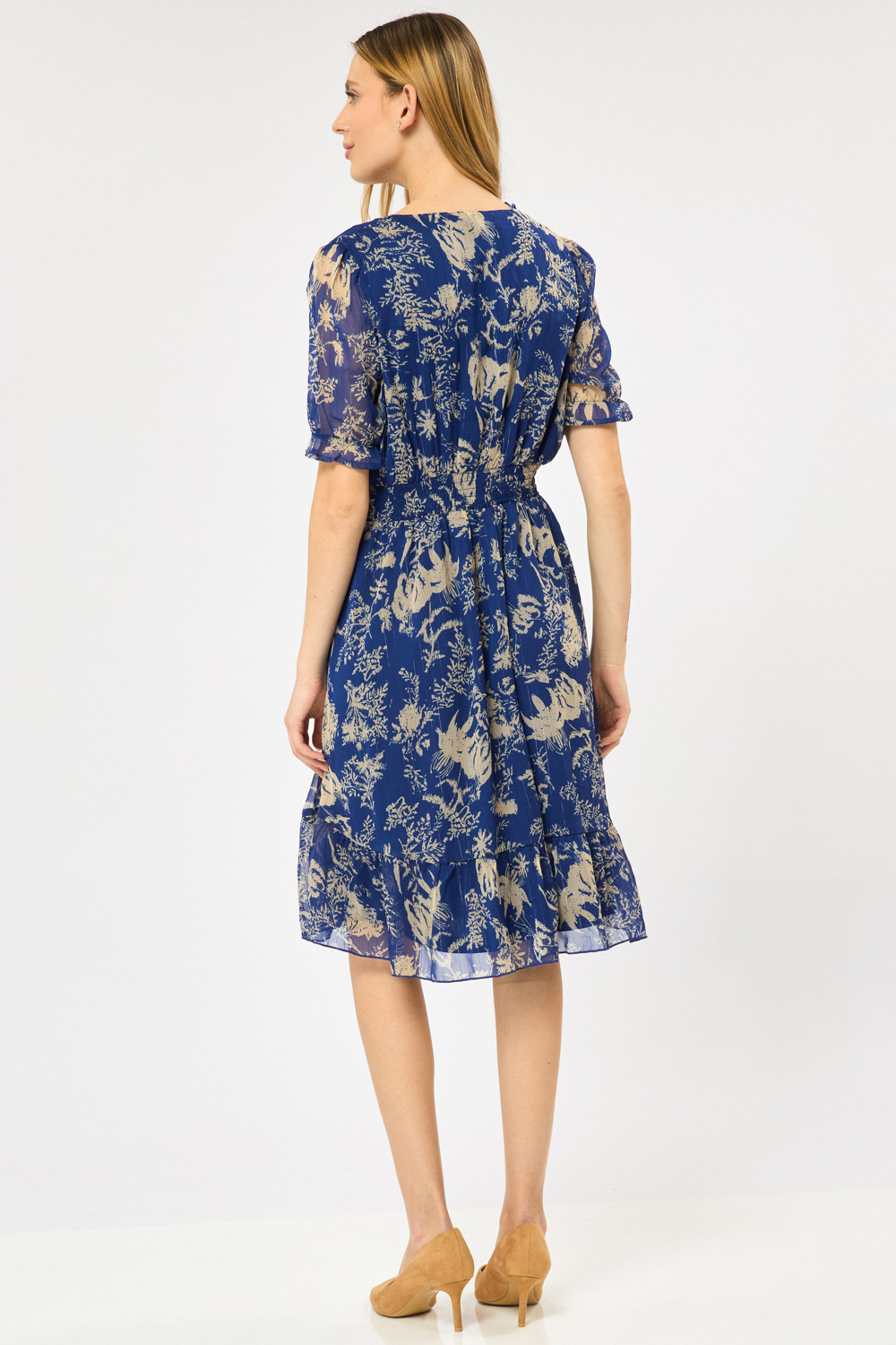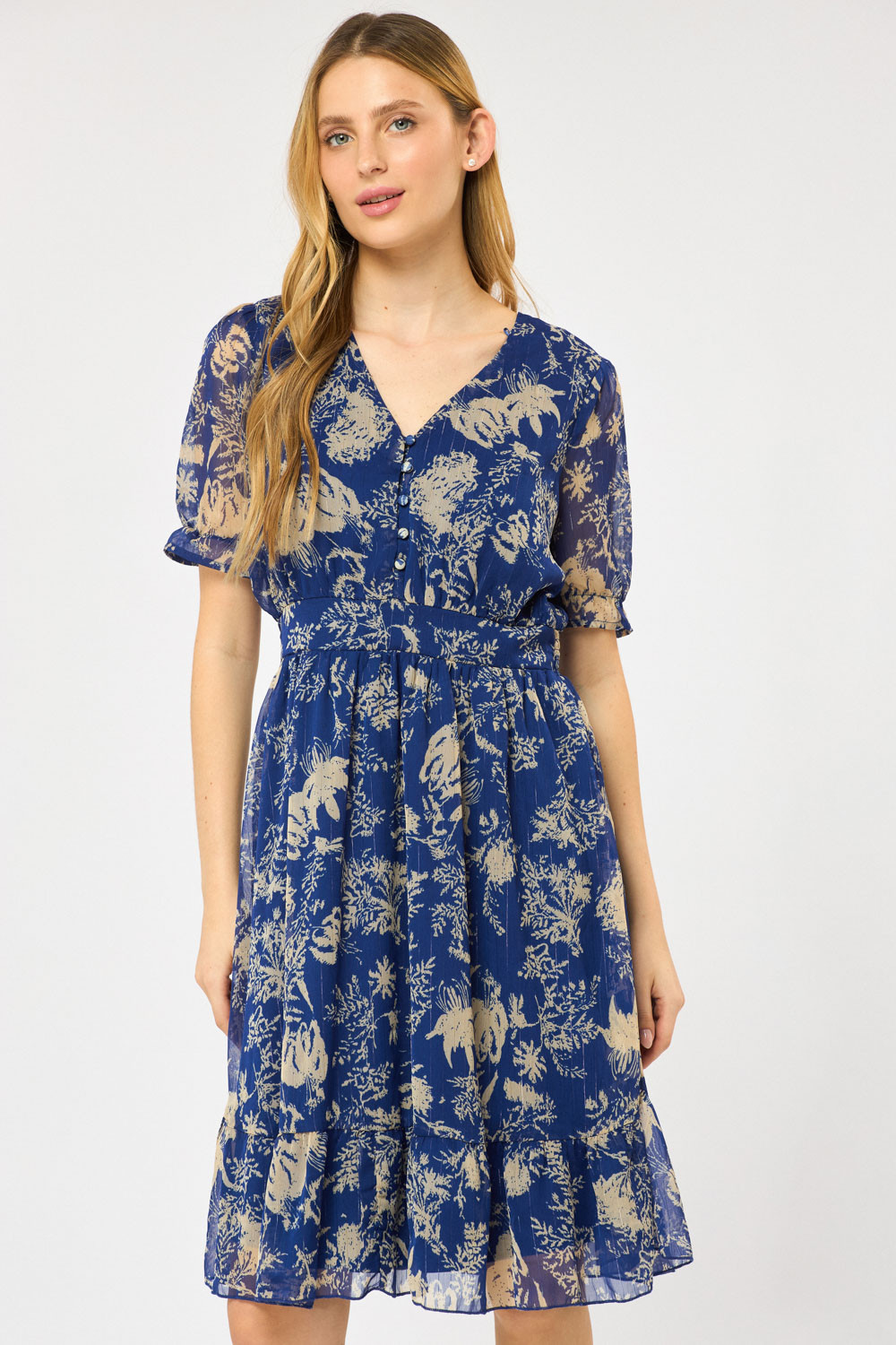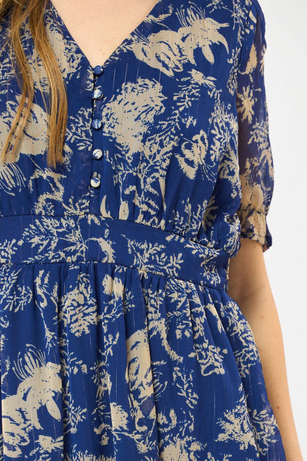 שמלת שיפון בהדפס עדין בגזרה נשית מחשוף V וכפתורים מצופים בד מותן אלסטית בגב ושרוולים קצרים תפוחים סיומת מתרחבת למראה קליל ונוח